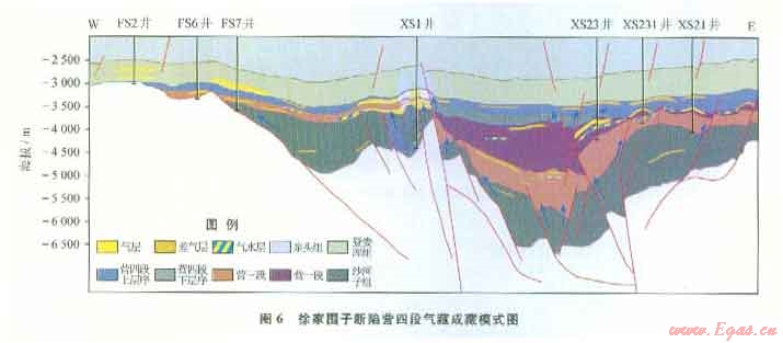 摘 要 松遼盆地徐家圍子斷陷下白堊統(tǒng)營城組四段致密砂礫巖儲層是該區(qū)深層天然氣勘探的儲量接替層系之一,為預(yù)測其有利勘探區(qū)帶,應(yīng)用高精度層序地層學(xué)方法,研究了營四段層序地層與致密氣藏形成的關(guān)系。①根據(jù)地層發(fā)育特征、地層旋回性和巖相發(fā)育特征,將營四段劃分為2個三級層序,每一層序界面都有明顯的地震響應(yīng)、測井響應(yīng)和沉積學(xué)標志特征。②建立了營四段層序地層格架,營四段下層序(Sql)分布僅局限在斷陷中心部位,發(fā)育半深湖一扇三角洲前緣亞相,以暗色泥巖為主,其為優(yōu)質(zhì)的烴源巖,可為上覆營四段提供氣源;營四段上層序(Sq2)的辮狀河三角洲前緣亞相物性好,是主要儲層發(fā)育的有利部位。③構(gòu)建了營四段致密砂礫巖氣藏的2種成藏模式:一種是沙河子組為烴源巖,斷裂為運移通道,砂礫巖與火山巖為儲層的下生上儲式成藏模式,有利勘探區(qū)位于興城、徐東和徐南地區(qū),預(yù)測天然氣資源潛力達450×108 m3;另一種是營四段下層序暗色泥巖為烴源巖,上層序砂礫巖為儲層,自生自儲或下生上儲式成藏模式,有利區(qū)位于斷陷中心的XS22井區(qū),預(yù)測天然氣資源潛力約為l00×108 m3。