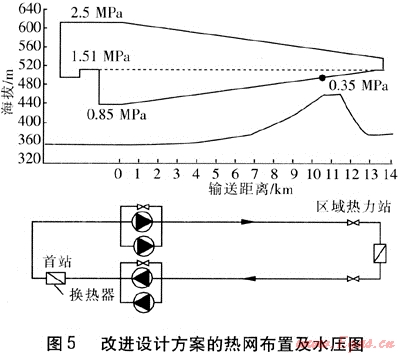 按靜態(tài)水力分析,初步設(shè)計(jì)方案是合理的,最大壓力在首站處(壓力為1.66MPa),外部管網(wǎng)靜態(tài)運(yùn)行壓力小于1.6MPa。動(dòng)態(tài)水力分析顯示,初步設(shè)計(jì)方案的設(shè)計(jì)、運(yùn)行易由于壓力的大幅度波動(dòng)產(chǎn)生超壓或汽化,導(dǎo)致嚴(yán)重的安全問題。為提高輸送干線的安全性,需對初步設(shè)計(jì)方案進(jìn)行改進(jìn):提高設(shè)計(jì)壓力,取消中繼泵站,系統(tǒng)最大壓力為2.5MPa;在首站處供水溫度提高為135℃,回水溫度不變,供回水溫差加大5℃,流量減小8%;首站循環(huán)泵采用兩級泵形式,保證控制的穩(wěn)定性。改進(jìn)設(shè)計(jì)方案的熱網(wǎng)布置及水壓圖見圖5。