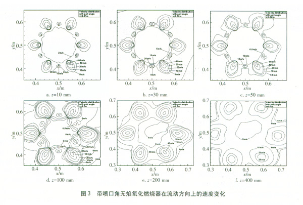 圖4給出了帶噴口角無(wú)焰氧化燃燒器溫度沿燃燒器軸線方向的變化情況。從圖4a可看出,燃燒器區(qū)域的最高溫度1 700 K位于空氣射流的某個(gè)半徑處,這表示空氣射流卷吸其附近的天然氣和燃燒產(chǎn)物使氧化劑、燃料和產(chǎn)物的比例在該空氣射流半徑處達(dá)到最佳的狀態(tài)。燃燒首先在那里發(fā)生,朝空氣射流中心的周圍擴(kuò)散。當(dāng)流動(dòng)進(jìn)一步向下游推進(jìn)時(shí),燃燒強(qiáng)度進(jìn)一步增加,溫度逐漸上升,最高溫度大約出現(xiàn)在z=100 mm處。在z=100mm之后,由于燃料大部分被燃燒,溫度又開(kāi)始逐漸降低,并且由于混合更充分,溫度也變得更均勻。另外,由于噴嘴沿軸心具有向外的傾角,沿著軸線方向射流問(wèn)的間隔也變得越大(即從射流整體運(yùn)動(dòng)來(lái)看,它像一個(gè)圓錐擴(kuò)展運(yùn)動(dòng),因此沿著石方向,即圓錐軸線方向,在圓錐橫截面上的各分射流間隔越來(lái)越大),在空氣射流和燃料射流混合之前,它們更充分地被燃燒產(chǎn)物所稀釋,燃燒區(qū)域更大,因此最高溫度也較低。