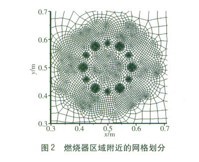 數(shù)值求解的精度與網(wǎng)格的類型和密度緊密相關(guān)。本研究中燃料口和空氣口的尺寸與整個(gè)爐膛的尺寸相比很小,由于在燃燒器內(nèi)同時(shí)進(jìn)行著流動(dòng)、傳熱和化學(xué)反應(yīng),因此在此附近區(qū)域的熱力參數(shù)變化激烈,此區(qū)域的網(wǎng)格必須有更小的尺寸以適應(yīng)參量的劇烈變化。圖2為主流方向某個(gè)面上燃燒器附近區(qū)域的網(wǎng)格劃分。
