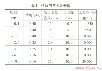 ①壓力測量系統(tǒng):選取l個或多個合適的壓力測量點,安裝壓力表,測量管內(nèi)的壓力。試驗用壓力表的量程根據(jù)試驗壓力選定,一般為試驗壓力的1.5~2倍,精度等級和分度值見表l。