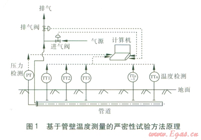 如上所述,采用現(xiàn)有的嚴密性試驗方法無法準(zhǔn)確判斷燃氣管道的嚴密性情況,因此本文提出一種基于管壁溫度測量的嚴密性試驗方法。該方法原理見圖l,具有下列特點: