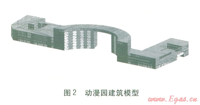能耗模擬軟件Energyplus在基本使用特性、計(jì)算能力和設(shè)備兼容性等方面較為突出[13-16],但需要友好的用戶圖形界面與之配合[17],Designbuilder是專門針對(duì)Energyplus開發(fā)的用戶圖形界面軟件。利用Designbuilder軟件建立動(dòng)漫園建筑模型,見圖2。相關(guān)能耗模擬參數(shù)為:①圍護(hù)結(jié)構(gòu)。外墻傳熱系數(shù)為0.52 W/(m2·K);屋面、樓板傳熱系數(shù)為0.44W/(m2·K);外窗傳熱系數(shù)為2.70 W/(m2·K),自身遮陽系數(shù)為0.70,可見光透射比(4個(gè)朝向相同)為0.40,建筑各朝向(含透明幕墻)窗墻比均小于0.70。②散熱量及人員密度。大廳:照明散熱量為13 W/m2,設(shè)備散熱量為13 W/m2,人員密度為0.3人/m2。走廊:照明散熱量為5 W/m2,人員密度為0.025人/m2。餐廳:照明散熱量為9 W/m2,設(shè)備散熱量為5 W/m2,人員密度為0.4人/m2。辦公室:照明散熱量為9 W/m2,設(shè)備散熱量為30 W/m2,人員密度為0.25人/m2。競(jìng)技廳:照明散熱量為18 W/m2,設(shè)備散熱量為30 W/m2,人員密度為0.6人/m2。③新風(fēng)量:大廳、餐廳、競(jìng)技廳大于等于