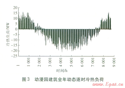 采用Energyplus模擬計(jì)算動(dòng)漫園建筑全年動(dòng)態(tài)逐時(shí)冷熱電負(fù)荷。全年動(dòng)態(tài)逐時(shí)冷熱負(fù)荷見圖3,圖中正值為熱負(fù)荷,負(fù)值為冷負(fù)荷。由圖3可知,全年最大冷負(fù)荷為20 532.8 kW,最大熱負(fù)荷為15 987.3kW。建筑全年各時(shí)段用電負(fù)荷(不含空調(diào)系統(tǒng)用電負(fù)荷)比較均衡,全年最大用電負(fù)荷為6 883.5 kW。