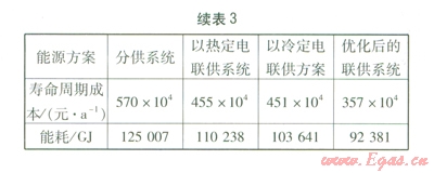 以熱定電聯(lián)供方案按照吸收式機(jī)組供熱量與熱負(fù)荷之比確定。經(jīng)模型優(yōu)化后,當(dāng)聯(lián)供系統(tǒng)壽命周期成本最小時(shí),吸收式機(jī)組供熱量與熱負(fù)荷之比為0.4,即以熱定電聯(lián)供方案中吸收式機(jī)組的供熱量確定為熱負(fù)荷的40%,再根據(jù)吸收式機(jī)組的制熱性能系數(shù)確定所需熱量,從而確定以熱定電聯(lián)供系統(tǒng)的配置方案。以冷定電聯(lián)供方案的確定與以熱定電聯(lián)供系統(tǒng)方法基本一致,區(qū)別在于,經(jīng)模型優(yōu)化后,當(dāng)聯(lián)供系統(tǒng)壽命周期成本最小時(shí),吸收式機(jī)組的供冷量與冷負(fù)荷之比為0.3。由表3可知,優(yōu)化后的聯(lián)供系統(tǒng)壽命周期成本及能耗最低,這表明優(yōu)化后的聯(lián)供系統(tǒng)在經(jīng)濟(jì)性及節(jié)能方面均具有一定優(yōu)勢(shì)。