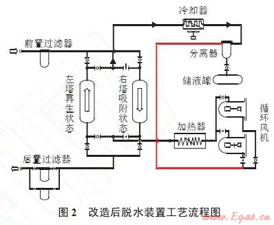 (2)脫水裝置雙塔閉式循環(huán)再生時(shí),常因系統(tǒng)壓力超高使再生被迫停止,即使減壓再生,吸附塔與再生塔會(huì)相互污染,無(wú)法獲得理想的再生效果。