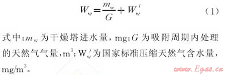 根據(jù)上述已知條件計(jì)算可得,在吸附周期(處理天然氣,使其含水量符合國(guó)家標(biāo)準(zhǔn)的連續(xù)工作時(shí)間)內(nèi),干燥塔最多可吸附45kg的水(分子篩動(dòng)態(tài)吸附量為靜態(tài)吸附量的10%)。由式(1)可得,改造前工藝來(lái)氣含水量908mg/m3,改造后工藝來(lái)氣含水量53mg/m3。