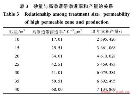 從表3知,隨著加砂規(guī)模的增大,高滲透帶的滲透率和壓裂后的產(chǎn)量逐漸增大,當(dāng)單簇高滲透帶加砂規(guī)模大于25m3時,累積產(chǎn)量增加趨勢減緩。由圖7和圖8數(shù)值模擬結(jié)果知本井優(yōu)化的高滲透帶滲透率上限為40×10-3μm2,對應(yīng)的砂量為20~25m3。綜合考慮施工風(fēng)險(xiǎn),建議本井高滲透帶滲透率取30×10-3μm2左右,每簇高滲透帶的砂量為15~20m3。