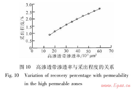 在建立的數(shù)值模型中嵌入高滲透帶,改變高滲透帶的特征參數(shù),通過數(shù)值模擬分析高滲透帶對累積產(chǎn)量和采出程度的影響。