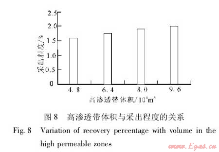 圖7描述了高滲透帶數(shù)量為8簇時,單簇高滲透帶體積與累積產(chǎn)量的關(guān)系。單簇高滲透帶體積為8.0×104m3時,累積產(chǎn)量為4790.8t,采出程度1.9%;高滲透帶體積為9.6×104m3時,累積產(chǎn)量4995.8t,采出程度2.0%(圖8)??梢姡S著高滲透帶體積增加,累積產(chǎn)量、采出程度增加,當(dāng)單簇高滲透帶體積大于8.0×104m3時,累積產(chǎn)量、采出程度增加減緩。為最大限度地提高本井采出程度,兼顧斷層影響,最終確定單簇高滲透帶體積為9.6×104m3。