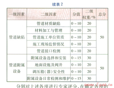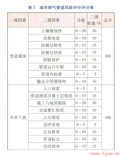 燃氣管道的風險評價方法通常以W.Kent Muhlbaue提出的風險評價模型(評分法)為依據(jù),在W.Kent Muhlbaue所著的《管道風險管理手冊》中確定的4類評分指標分別是第三方指數(shù)、腐蝕指數(shù)、設計指數(shù)、誤操作指數(shù)[3],對長輸油氣管道有很強的針對性,不一定完全適用于城市埋地燃氣管道。在本文評分指標體系的構(gòu)建中,將把文獻[3]評分法中不相關、不適應的指標予以剔除,根據(jù)城鎮(zhèn)燃氣管道的特點對指標重新分類,并進行適當調(diào)整和補充,確定4大評分指數(shù),分別為腐蝕指數(shù)、外界干擾指數(shù)、管道缺陷指數(shù)、管道附屬設備失效指數(shù)。城市燃氣管道風險評價評分表見表2。
