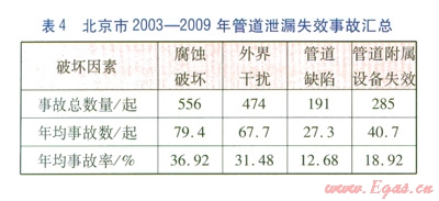 由表l可知,引起北京城市燃氣管道泄漏的原因中,管道腐蝕和外界干擾引起的管道事故所占比例較高,兩者之和超過事故總數(shù)的68%,即管道腐蝕和外界干擾是管道失效的主要原因。此外,從2003年至2009年,外界干擾引起管道失效的比例有明顯下降,而管道附屬設備失效引起的事故比例有所上升,說明近年來燃氣管道企業(yè)對于管道的管理力度有所加大,社會及施工單位對燃氣管道的安全意識有所加強。而燃氣管道附屬設備由于種類多、數(shù)量大、分布散等特點,檢測相對復雜,因此容易被管道巡線檢查所忽視,其逐年升高的泄漏失效率應在風險評價中引起足夠的重視。