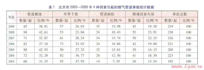 全國各地區(qū)、城市間存在差異,本文針對北京市燃氣管道失效事故統(tǒng)計數(shù)據(jù)(見表l),分析影響北京市燃氣管道事故的主要原因。