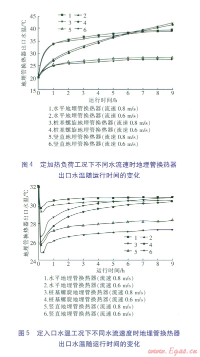 在定加熱負(fù)荷工況下,不同水流速度時地埋管換熱器出口水溫隨運行時間的變化見圖4。由圖4可知,豎直地埋管換熱器出口水溫最低,換熱性能最好。運行前期,樁基螺旋地埋管換熱器出口水溫低于水平地埋管換熱器,隨著運行時間的延長,樁基螺旋地埋管換熱器出口水溫升高較快。運行6 h后,樁基螺旋地埋管換熱器出口水溫高于水平地埋管換熱器。