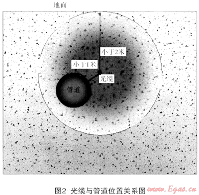 受當(dāng)前儀器設(shè)備精度所限,只能分析出光纖橫截面為中心半徑2m內(nèi)振動聲音信號。即,光纜有效監(jiān)測半徑只有2m,所以,管道必須完全處在光纜為中心2m包絡(luò)線之內(nèi),否則將有部分管體受不到有效保護(如圖2)。