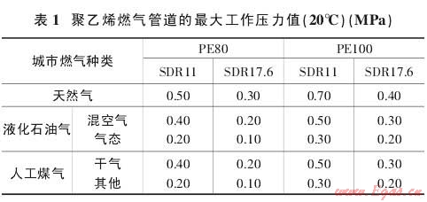 1.2.2 在聚乙烯燃?xì)夤艿赖膲毫υO(shè)計(jì)中,還需要考慮到燃?xì)庵兴姆枷銦N類物質(zhì)所產(chǎn)生的影響,以及管道的施工條件等因素,根據(jù)國(guó)家相關(guān)的行業(yè)標(biāo)準(zhǔn),聚乙烯燃?xì)夤艿涝试S的最大工作壓力如表1。
