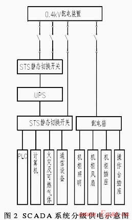 從圖1可見,SCADA系統(tǒng)正常情況下由UPS供電,在UPS設備故障時由變電所直接供電。該系統(tǒng)的設計考慮多級冗余,一是UPS進線冗余設置,二是在線式UPS本身具有旁路功能,即正常情況下一路經(jīng)濾波整流直接輸出,故障情況下另一路由后備電池經(jīng)逆變器后輸出,三是一路變電所低壓電作為UPS的備用。以上供電系統(tǒng)多級冗余設計時需設置STS靜態(tài)切換開關。