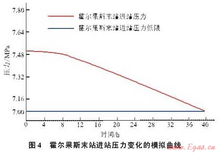 根據(jù)中亞天然氣管道霍爾果斯末站的進站壓力7.5MPa和出口流量700萬m3/h的工況進行模擬計算,No.8.2閥室關(guān)閉36h后,霍爾果斯末站進站壓力降到7.1MPa(圖4),即No.8.2閥室關(guān)閉36h后將影響到下游正常運行。