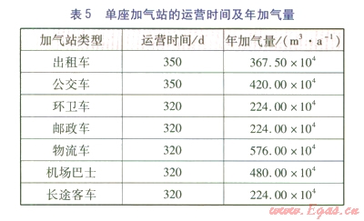 按30%資本金考慮,其余為國內(nèi)商業(yè)銀行貸款,貸款利率為7.05%。單座加氣站的運(yùn)營時(shí)間及年加氣量見表5。