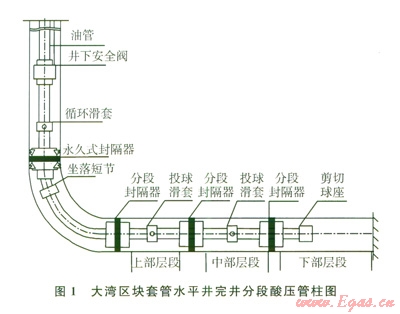 研究結(jié)果表明,氣井產(chǎn)能隨分段數(shù)目的增加而增加,但增產(chǎn)幅度隨之減小,當(dāng)分段數(shù)目達(dá)到一定數(shù)量時(shí),增加分段數(shù)的效果已不明顯。根據(jù)單井實(shí)鉆資料及測井解釋結(jié)果,綜合考慮水平井段儲(chǔ)層、夾層、裂縫發(fā)育情況及封隔條件,結(jié)合儲(chǔ)層改造能力和酸壓模擬結(jié)果,并考慮投產(chǎn)作業(yè)施工的安全性和經(jīng)濟(jì)性,大灣區(qū)塊水平井段分2~3段完井。對(duì)投產(chǎn)井段長度約l 000 m的氣井,分段數(shù)設(shè)計(jì)為3段,投產(chǎn)井段長度約600 m的氣井,分段數(shù)設(shè)計(jì)為2段。