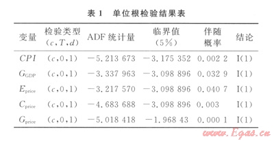 表1中,檢驗(yàn)類型(c,T,d)分別代表所檢驗(yàn)的序列中含有截距、時(shí)間趨勢以及滯后階數(shù);按AIC準(zhǔn)則確定滯后階數(shù)。結(jié)果表明,CPI、GGDP、Eprice、Cprice、Gprice的水平值都是非平穩(wěn)的,但其一階差分是平穩(wěn)的(ADF檢驗(yàn)即增廣迪基-福勒檢驗(yàn),其統(tǒng)計(jì)量的絕對值大于臨界值的絕對值,表示變量平穩(wěn)),因此,這5個(gè)變量序列都是在95%置信水平下的一階單整序列[表
