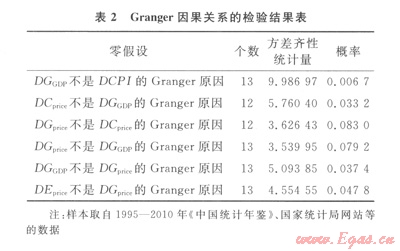 從Granger因果關(guān)系檢驗(yàn)中,可以較直觀地分析出變量之間的關(guān)系,得出以下結(jié)論:①在10%的顯著水平下,DGprice是DCprice的Granger原因;②在10%的顯著水平下,DGprice是DGprice的Granger原因;③在5%的顯著水平下,DGGDP是DCPI的Granger原因;④在5%的顯著水平下,DEprice是DGprice的Granger原因。