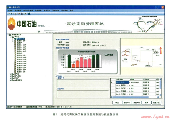 圖l為龍崗氣田試采工程腐蝕監(jiān)測系統(tǒng)功能主界面圖,通過中間數(shù)據(jù)庫實(shí)現(xiàn)與龍崗氣田數(shù)字化巡檢系統(tǒng)和三維地理信息系統(tǒng)的數(shù)據(jù)交互,實(shí)現(xiàn)腐蝕數(shù)據(jù)的圖形展示,為管理者提供決策依據(jù)。