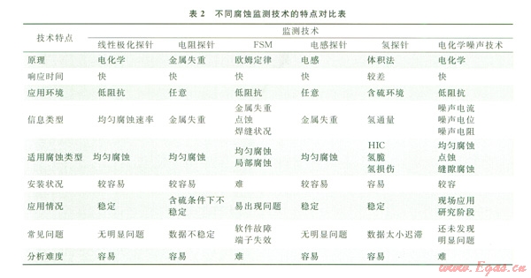 5)電阻探針、電感探針、線性極化探針、腐蝕掛片及水分析等傳統(tǒng)的腐蝕監(jiān)測方法被廣泛用于高含硫氣田。FSM、氫探針技術(shù)、電化學(xué)噪聲技術(shù)等腐蝕監(jiān)測新技術(shù)在研究點(diǎn)蝕、縫隙腐蝕和氫致開裂等方面具有獨(dú)特的優(yōu)勢。