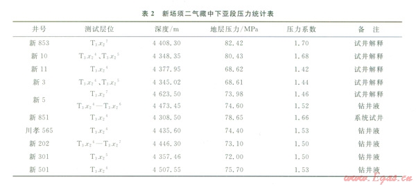 新場(chǎng)氣田須二段氣藏中下亞段共有11個(gè)測(cè)試數(shù)據(jù),計(jì)算的地層壓力如表2所示。從表2中可以看出,壓力系數(shù)在1.42~1.70之間一個(gè)較大范圍內(nèi)變化,總體表現(xiàn)出不同目標(biāo)區(qū)(或裂縫體系)壓力系數(shù)不同,如中部裂縫體系壓力系數(shù)高(新851井須二4亞段壓力系數(shù)l.66,新853井壓力系數(shù)1.70),而該裂縫體系以西地區(qū)壓力系數(shù)大幅度降低(新3井壓力系數(shù)1.44、新301井壓力系數(shù)1.50),氣藏東部裂縫體系壓力系數(shù)較低(新5井壓力系數(shù)1.52,新501井壓力系數(shù)1.53),充分說(shuō)明氣藏?zé)o統(tǒng)一的壓力系統(tǒng)。