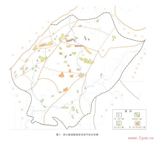 近60年在四川盆地對(duì)陸相層系的油氣勘探取得了大量成果,發(fā)現(xiàn)油氣田60余個(gè)(圖1),探明天然氣儲(chǔ)量約7 000×108m3,顯示出四川盆地陸相層系具有“多套砂巖油氣層與頁(yè)巖氣層交叉疊置、滿盆分布”的特點(diǎn),砂巖油氣和頁(yè)巖氣兼顧立體勘探格局將向全盆地展開(kāi),前景十分廣闊。