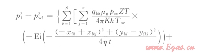 pi為地層原始?jí)毫Γ?span lang="EN-US">Pa;pwf為井底流壓,Pa;N為裂縫條數(shù),條;n為裂縫等分?jǐn)?shù),個(gè);qfkj為第k條裂縫第j個(gè)點(diǎn)匯的產(chǎn)量,m3/s;μg為黏度,Pa·s;psc為臨界壓力,Pa;Z為氣體偏差因子,無因次;T為氣層溫度,℃;K為地層滲透率,mD;h為儲(chǔ)集層厚度,m;t為生產(chǎn)時(shí)間,s;Tsc為氣體臨界溫度,℃;xfil為第i條裂縫第l個(gè)點(diǎn)匯的橫坐標(biāo),m;xfkj為第k條裂縫第j個(gè)點(diǎn)匯的橫坐標(biāo),m;yfil為第i條裂縫第l個(gè)點(diǎn)匯的縱坐標(biāo),m;yfkj為第k條裂縫第j個(gè)點(diǎn)匯的縱坐標(biāo),m;η為導(dǎo)壓系數(shù),0.