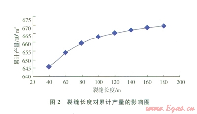 圖2是不同裂縫半長生產(chǎn)1年的累計(jì)產(chǎn)量結(jié)果??梢钥闯觯S著裂縫長度增加,累計(jì)產(chǎn)量逐漸增大,隨著裂縫長度進(jìn)一步增加,增幅變小。這是因?yàn)榱芽p長短反映了儲(chǔ)層的供氣面積大小。當(dāng)裂縫長度增加到一定程度后,縫長越大,氣體在裂縫中流動(dòng)時(shí)的摩阻越高,反而會(huì)影響產(chǎn)量。在本算例中,最佳裂縫半長為60~80 m。