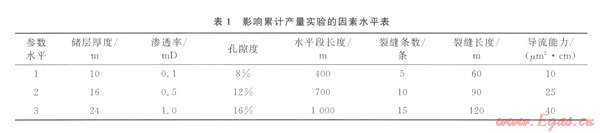 將儲(chǔ)層厚度、滲透率、孔隙度、水平段長度、裂縫條數(shù)、裂縫長度、裂縫導(dǎo)流能力作為影響累計(jì)產(chǎn)量的7個(gè)因素,再根據(jù)各因素選取了3個(gè)水平(表1)。