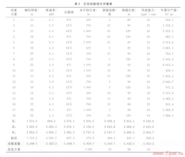 2)采用正交試驗(yàn)分析理論對(duì)氣藏壓裂水平井產(chǎn)能參數(shù)的影響程度進(jìn)行了分析,并運(yùn)用灰色關(guān)聯(lián)分析方法進(jìn)行了檢驗(yàn),找出了影響研究區(qū)塊壓裂水平井產(chǎn)能的主要參數(shù)排序依次為:地層滲透率、儲(chǔ)層厚度、孔隙度、水平段長度、裂縫條數(shù)、裂縫長度、導(dǎo)流能力。