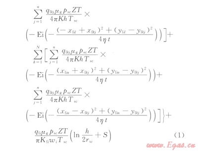 將裂縫單翼均等分成竹份,每等份可以看成是一個(gè)點(diǎn)匯。利用無限大均勻地層點(diǎn)匯定流量的壓降公式,可以求出該點(diǎn)匯對(duì)地層中任意一點(diǎn)產(chǎn)生的壓降[8-10];將地層任意一點(diǎn)替換為裂縫尖端,就可以得到所有點(diǎn)匯同時(shí)生產(chǎn)時(shí)對(duì)裂縫尖端產(chǎn)生的壓降;考慮到裂縫半長遠(yuǎn)大于水平井筒半徑,裂縫內(nèi)流體從裂縫邊緣向井筒周圍聚集,第i條裂縫可以看成是流動(dòng)直徑為裂縫長度、地層厚度為裂縫寬度、邊界壓力為裂縫尖端壓力、井底流壓為水平井井筒內(nèi)壓力的微型平面徑向流油藏;根據(jù)壓力連續(xù)和流量守恒方程,就能得到考慮裂縫干擾的壓裂水平井油井產(chǎn)量預(yù)測模型[2,5];進(jìn)一步根據(jù)壓力函數(shù)的定義和真實(shí)氣體狀態(tài)方程,并將地層條件下的產(chǎn)量換算為地面標(biāo)準(zhǔn)情況下氣體產(chǎn)量,就可以得到氣藏壓裂水平井產(chǎn)量預(yù)測模型: