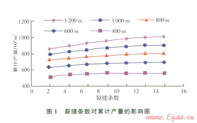 圖1是不同水平段長度、不同裂縫條數(shù)下生產(chǎn)l年的累計(jì)產(chǎn)量??梢钥闯?,隨著裂縫條數(shù)增加,累計(jì)產(chǎn)量先增加最后趨于平穩(wěn)。因?yàn)殡S著裂縫條數(shù)增加,裂縫間距變小,相互間干擾加重,導(dǎo)致每條裂縫產(chǎn)量減小造成的??紤]到裂縫條數(shù)增加,作業(yè)成本增大,因此存在一個(gè)最佳裂縫條數(shù)。當(dāng)水平段長度為