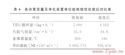 綜上可知,在優(yōu)化后的操作參數(shù)下運行,凈化裝置單位能耗值比優(yōu)化前平均降低了l2.23%,TEG循環(huán)量比優(yōu)化前有明顯的降低,從而降低吸收劑的循環(huán)量和再生塔的能耗。汽提氣的用量基本保持不變,同時,再生器重沸器的溫度明顯降低。再生器重沸器的溫度降低會減少熱量需求。