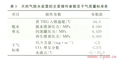 目前,國內天然氣脫水主要采用三甘醇(TEG)脫水法,川渝地區(qū)某天然氣凈化廠600×104 m3/d天然氣脫水裝置也采用典型的TEG脫水法脫除來自脫硫單元凈化濕氣中的水分,以降低天然氣的露點。表l為該天然氣脫水裝置的主要操作參數(shù)及干氣標準。圖2為該天然氣脫水裝置的工藝流程圖。