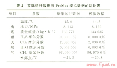 依據(jù)該天然氣脫水裝置的運行數(shù)據(jù),將各原料氣及TEG的參數(shù)輸入脫水裝置工藝模型,調整模型各 個參數(shù),使模擬數(shù)據(jù)與實際運行數(shù)據(jù)達到基本吻合,使輸出的凈化產品氣到達凈化干氣的氣質標準。表2為實際運行數(shù)據(jù)與ProMax模擬數(shù)據(jù)對比衷,據(jù)此來驗證所建立ProMax模型的準確性。
