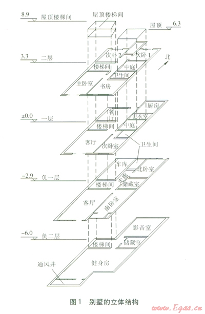 該建筑物共有21個(gè)主要功能房間(包含衛(wèi)生間、車庫(kù)、儲(chǔ)藏室等),兩個(gè)豎向氣流通道(樓梯間、中庭)。樓梯間是貫通負(fù)二層至屋頂?shù)娜诵型ǖ?。中庭從一層通至屋頂,類似于舊式建筑的天井,是與室外相通的空間。別墅的立體結(jié)構(gòu)見圖1,圖中各層標(biāo)高的單位為m。