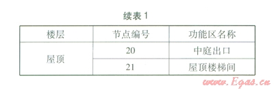 考慮到自然通風(fēng)狀態(tài)下應(yīng)避免污染,因此不將衛(wèi)生間、廚房等存在污染源的房間列入熱壓自然通風(fēng)網(wǎng)絡(luò)模型。熱壓自然通風(fēng)網(wǎng)絡(luò)模型見圖2。熱壓自然通風(fēng)網(wǎng)絡(luò)模型中各節(jié)點(diǎn)代表的功能區(qū)見表l。其中節(jié)點(diǎn)23設(shè)在通風(fēng)井底面,節(jié)點(diǎn)20設(shè)在屋頂表面,其他節(jié)點(diǎn)均設(shè)在各層高度方向的中間位置。由此可知各節(jié)點(diǎn)的高度差。