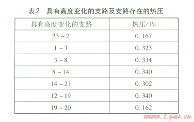 由圖2可知,共有7個(gè)支路具有高度變化(見表2),因此在這7個(gè)支路上存在熱壓,計(jì)算結(jié)果見表2。