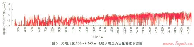 根據(jù)井壁穩(wěn)定性分析結(jié)果,深度小于2800m的地層當(dāng)量應(yīng)力低于地層巖石的綜合強度,氣體鉆井井壁穩(wěn)定性較好如圖2,而深度超過2800m的地層坍塌密度高于空氣鉆井臨界坍塌壓力當(dāng)量密度值(圖3),這些層段‘營氣鉆井過程中存在垮塌掉塊,可通過優(yōu)化鉆井參數(shù)來克服,并做好氣液轉(zhuǎn)換準備;千佛崖組—須家河組地層氣體鉆井穩(wěn)定性較差,YB3井在自流井組3727.8~3791.5m應(yīng)用氮氣鉆井,僅進尺63.7m,不但后期通井循環(huán)時間較長,鉆井費用也有所增加,在目前技術(shù)條件下該井段采用氣體鉆井還存在一定難度。