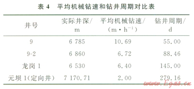 攻克了螺桿等鉆具無法攻克的二疊系極堅硬玄武巖,單趟最大進尺827m,除l5號井因鉆井液不適應(yīng)地層導(dǎo)致此井段出現(xiàn)5趟起下鉆外,大部分井實現(xiàn)兩趟從三疊系鉆完第二次開鉆的Æ241.3mm至奧陶系,平均單井節(jié)約時間達30.27d,大幅降低鉆井周期、提高了鉆井效率;井深6785m的直井9號同時應(yīng)用了此兩種提速技術(shù),平均機械鉆速l0.69m/h,鉆井周期僅55d,提速效果遠高于鄰井9-2號和其他油田相似深度井[8-12]。(表4)。能夠消除“卡—滑”現(xiàn)象并保持鉆頭對地層連續(xù)切削的TorkBuster配合高抗沖擊的專用PDC鉆頭U513M提速技術(shù)對塔北地區(qū)三疊系—奧陶系地層具有良好的適應(yīng)性。