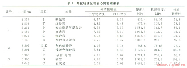 塔北地區(qū)地層自上而下主要為新生界第四系、新近系、古近系,中生界白堊系、侏羅系、三疊系,古生界二疊系、石炭系、泥盆系、志留系、奧陶系,部分區(qū)塊存在層位缺失。實鉆資料顯示古生界機械鉆速慢,為提速瓶頸地層。因此以該地區(qū)哈拉哈塘區(qū)塊為例,進行了一定數(shù)量的此井段巖心室內(nèi)測試,測試結(jié)果如表1所示。根據(jù)實鉆資料和巖心室內(nèi)試驗結(jié)果,總結(jié)塔北地區(qū)鉆井提速難點如下。