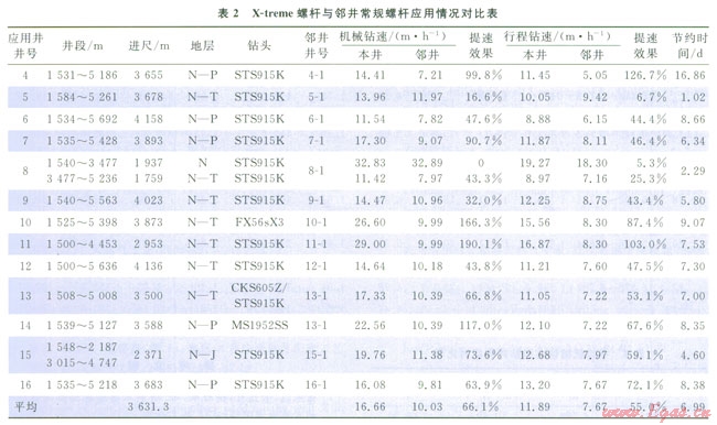 X-treme螺桿(Æ203mm)+PDC鉆頭復(fù)合鉆井技術(shù)在塔北地區(qū)哈拉哈塘、新墾、熱普區(qū)塊13口井第二次開鉆的Æ241.3mm井眼上部井段進行了應(yīng)用,應(yīng)用地層為新近系—三疊系、部分井進入二疊系頂部,平均單井進尺3631.3m,平均機械鉆速和行程鉆速分別為l6.66m/h和11.89m/h,表2為X-treme螺桿(Æ203mm)與鄰井常規(guī)螺桿應(yīng)用情況對比。