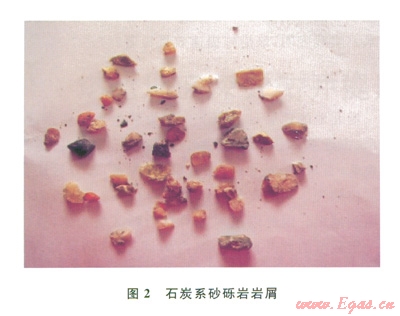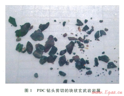 2)二疊系:巖性復(fù)雜,主要為玄武巖、砂巖和泥巖互層。地層硬度大,達l581.26MPa,可鉆性差,三牙輪可鉆性級值達7.65,PDC鉆頭可鉆性級值達6.1;玄武巖致密、性脆、硬度極高,耐磨性強,對鉆頭傷害極大,導(dǎo)致跳鉆現(xiàn)象,崩壞PDC鉆頭切削齒;PDC鉆頭失效造成多余的起下鉆,而換成牙輪鉆頭后機械鉆速極低,多分布于1~2m/h,低至1m/h,導(dǎo)致鉆井周期增大,為該地區(qū)鉆井難度最大的地層。圖l為塊狀玄武巖屑照片。