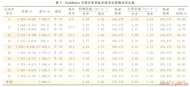 第二階段對鉆頭進行優(yōu)化,配合針對塔北地區(qū)設(shè)計的PDC鉆頭U513M在10口井第二次開鉆的Æ241.3mm下部井段進行了應(yīng)用,應(yīng)用地層為三疊系—奧陶系,平均單井進尺1284.5m,平均機械鉆速和行程鉆速分別為4.44m/h和3.2lm/h,與鄰井同井段應(yīng)用常規(guī)鉆井技術(shù)相比,分別提高170.7%和181.6%;表3為TorkBuster與鄰井常規(guī)鉆井技術(shù)應(yīng)用情況對比,TorkBuster+U513M技術(shù)提速效果顯著。