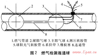堵球查漏一般都在燃氣管道內(nèi)壓力較低,且燃氣不流動或流速極小的情況下進行。將連通球放置妥當后,用球膽充氣軟膠管充入空氣升壓使球膽膨脹,這樣兩球間就形成一個與兩端隔絕的密閉空間。再用測壓軟膠管向此密閉空間充氣(以氮氣等惰性氣體為宜),達到一定壓力后,停止充氣。在測壓軟膠管的地面端接U型壓力計測壓觀察,如果這段空間的管道壁有破損而泄漏,則壓力會下降。如此移動檢查,即可確定泄漏點位置。在查漏實踐中,這種方法比較實用,但還有一些弊端和不方便的地方。