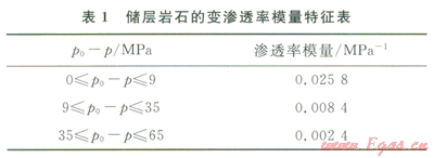 采用擬三軸應(yīng)力巖心夾持器測定該井取樣巖心在不同有效應(yīng)力下的滲透率,發(fā)現(xiàn)在儲層壓力范圍為0~65MPa時,表現(xiàn)為變滲透率模量特征,研究發(fā)現(xiàn)可以用3段滲透率模量來表征滲透率隨有效應(yīng)力變化的關(guān)系(表1)。